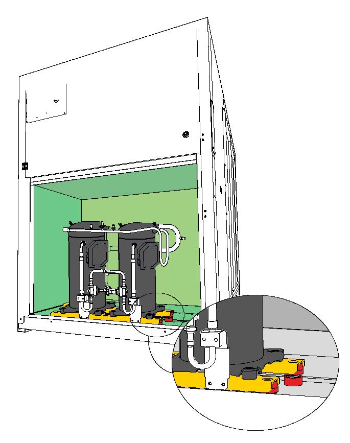 Le boîtier est isolé avec de la laine minérale de 50 mm d’épaisseur. Les conduites de réfrigérant du compresseur sont reliées au circuit frigorifique par des raccordements flexibles. La combinaison de ces systèmes entraîne une réduction du bruit de 10 à 12 dB (A).
