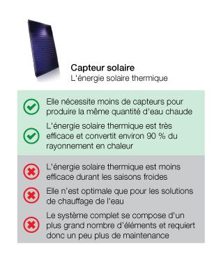 Avec le photovoltaïque, l’énergie solaire est d’abord convertie en électricité et cette électricité est ensuite utilisée pour chauffer l’eau. Avec un capteur solaire, on saute cette étape intermédiaire. La chaleur solaire est directement transmise dans l’eau, ce qui offre une efficacité beaucoup plus élevée.