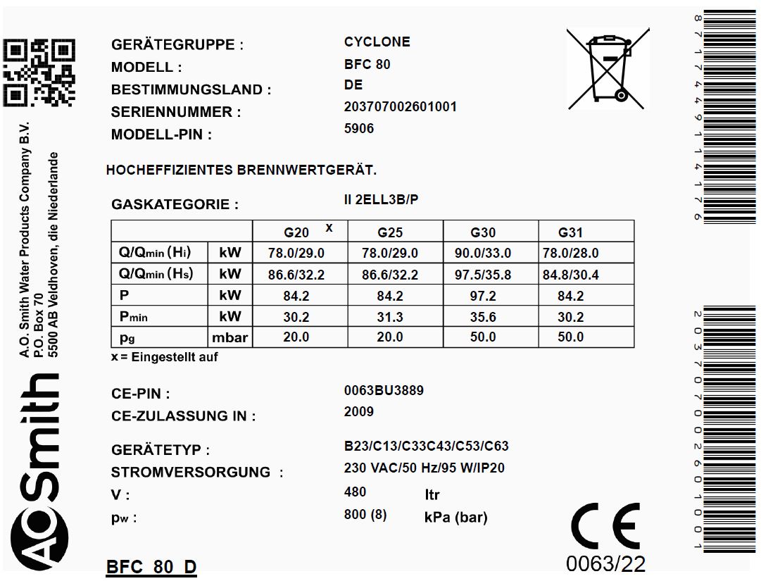 Die Seriennummer finden Sie auf dem Typenschild; ein Aufkleber, der wie der folgende aussieht (dieser ist für einen BFC Cyclone):