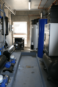 Esta granja de productos lácteos cuenta con tres robots ordeñadores y un tanque de leche de 12.000 litros. En este emplazamiento se instaló un BFC con un ICP (intercambiador de calor de placas). El agua caliente se utiliza para limpiar los robots y el tanque de leche. Gracias al ICP, el área adyacente al establo puede disfrutar de un suelo radiante.