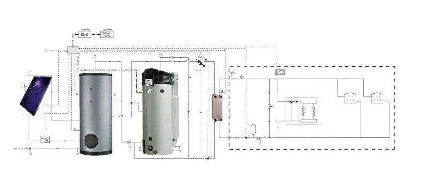 In dit voorbeeld wordt gebruik gemaakt van zonnecollectoren, een IT (indirecte boiler met voorraadvat), een SGS zonneboiler en Theta Dual Service.