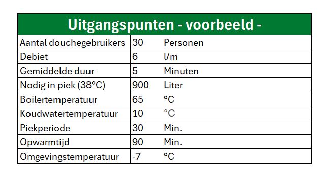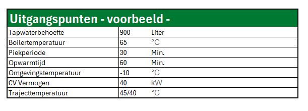 Dit keer is er ook ruimteverwarming vereist en de tapwaterbehoefte tijden de piekperiode ligt wederom op 900 liter: