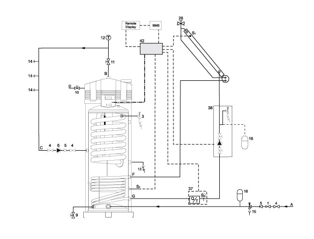 SGE is a compact installation with integrated solar heat exchanger. Apart from its excellent suitable size for restricted spaces, the SGE is also a very efficient appliance. The collectors are connected to the lower heat exchanger, and the heat is transferred from the collectors to the water. The upper heat exchanger afterheats, if necessary, until the water has reached the desired temperature. In this installation the solar contribution is fully utilized.